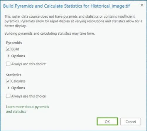 prompt to build pyramids and calculate statistics in ArcGIS Pro