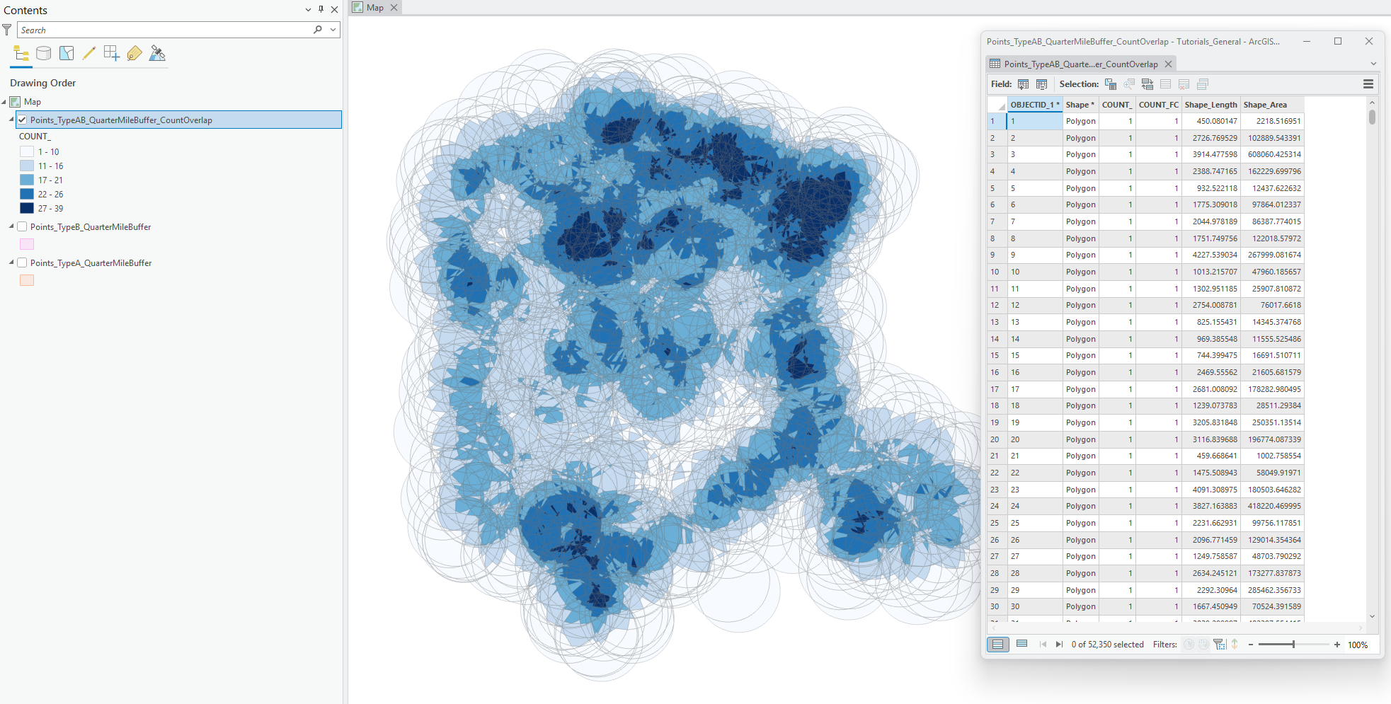 The images below include the output geometry (symbolized by number of overlapping features counted) as well as the output attribute table.