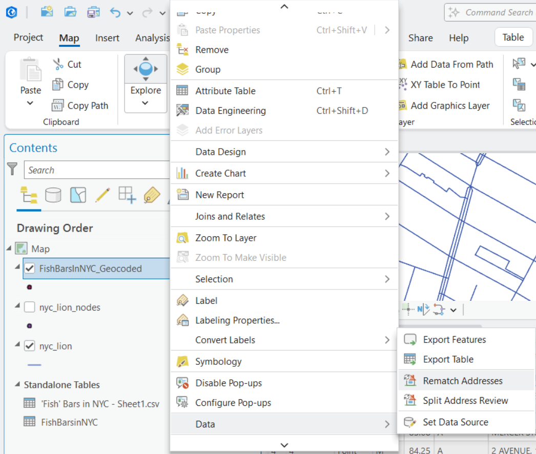 The Score attribute describes the quality of the match (between your source table’s values and the reference layer’s values) from 0-100. Generally, scores above 85 are considered a good match. If you have any locations with a score that is particularly low, or if you have points which did not successfully match, you can attempt to rematch addresses by right clicking on your newly geocoded layer, hover over Data and then select Rematch Addresses. This will allow you to interactively evaluate and rematch (where appropriate) all entries in your geocoded layer.