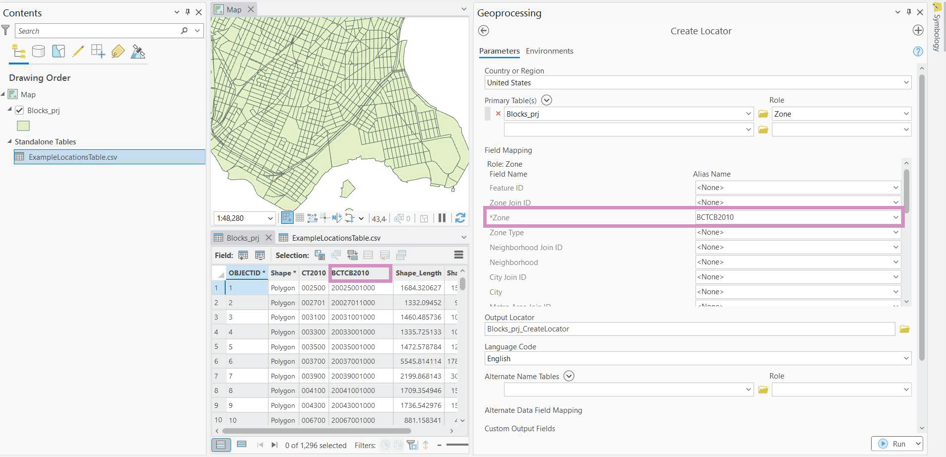 The example in this tutorial generates a locator to interpret the polygons in our reference layer of census blocks as “zones.” Each zone is identified in the reference layer by the values in the attribute field called BCTCB2010. (The values in this field will be compared to the location information in the source table to find potential matches.)