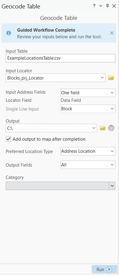 When the dialogue box opens up, it should be filled in based on the selections we made throughout the guided workflow of the Geocode Table Wizard. Double check your selections look adequate and make any changes if necessary. Now, you may run the Geocode Table tool.