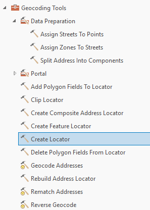 Access the Create Locator tool by navigating through the Geoprocessing Toolboxes > Geocoding Tools > Create Locator or by searching the tool’s name.