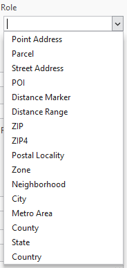 The specific parameters related to the address field(s) differ based on the Input Address Fields option (One field or Multiple fields). Whether based on a single field or multiple fields, here you indicate which field(s) in the source/input table corresponds to the locator’s reference information.