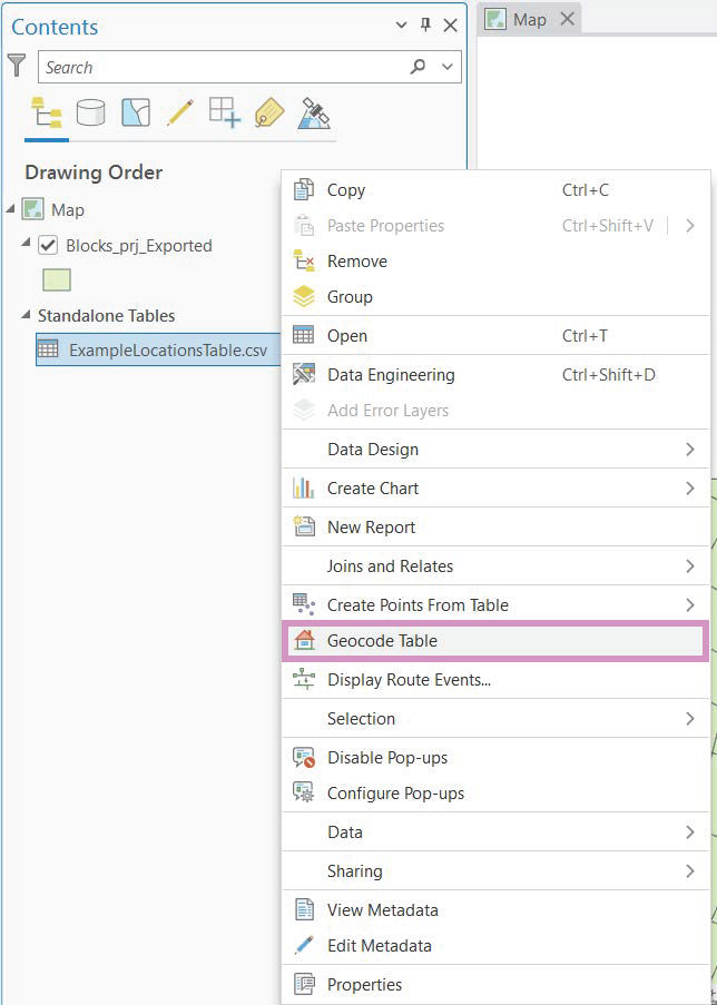 Alternatively, you can access a step-by-step wizard (if you are new to geocoding in ArcGIS Pro) that will populate the parameters of the tool for you interactively. To access the Geocode Table Wizard, right-click on the source table’s name in the Contents panel and click Geocode Table.
