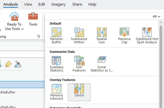 To access the Union tool, you can click through the Analysis tab (on the Main Menu ribbon) > Tools section > Overlay Features: Union.