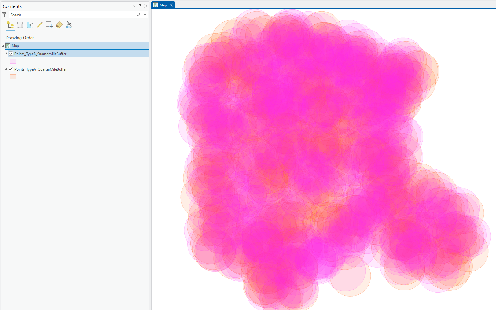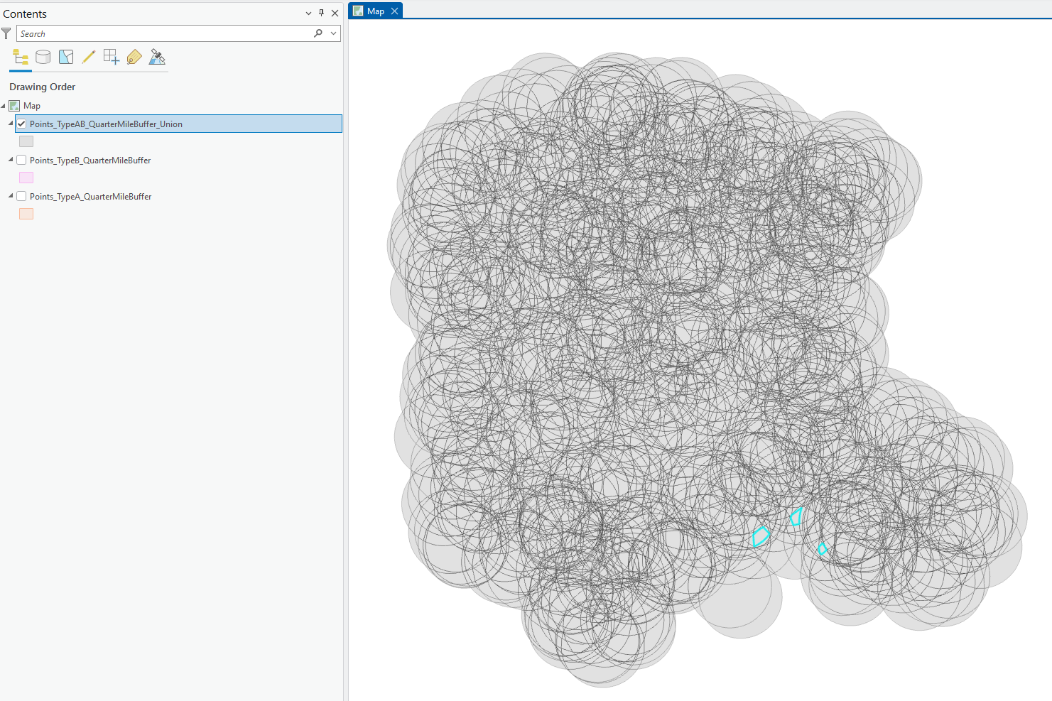 In this example, we will “unite” two polygon layers, each comprising buffer polygons generated from the points in the Standard Tutorial Data package.