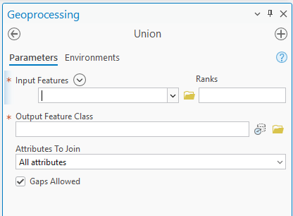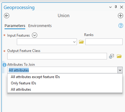 Attributes to Join: This dropdrop down menu allows you to choose which attributes to combine in the output, which is particularly relevant for results that represent the areas of overlap between input features.You can choose to maintain All Attributes (which is the default option), only the feature IDs (which is useful when the inputs have many attribute fields), or all attributes except for the feature IDs (to avoid confusion later in your analysis).