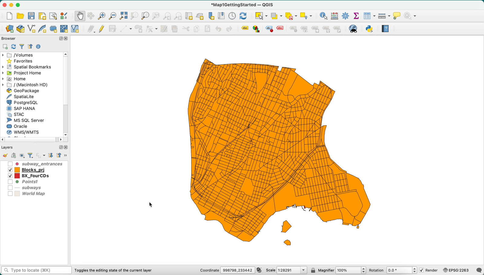 Individual features can also be directly identified from the map canvas. In the Attributes Toolbar, click the Identify Features tool. Click the name of the feature class for the features you would like to identify in the Layers Panel. Click the feature to be identified on the map canvas. The Identify Results panel on the right of the window will display the feature’s attributes.