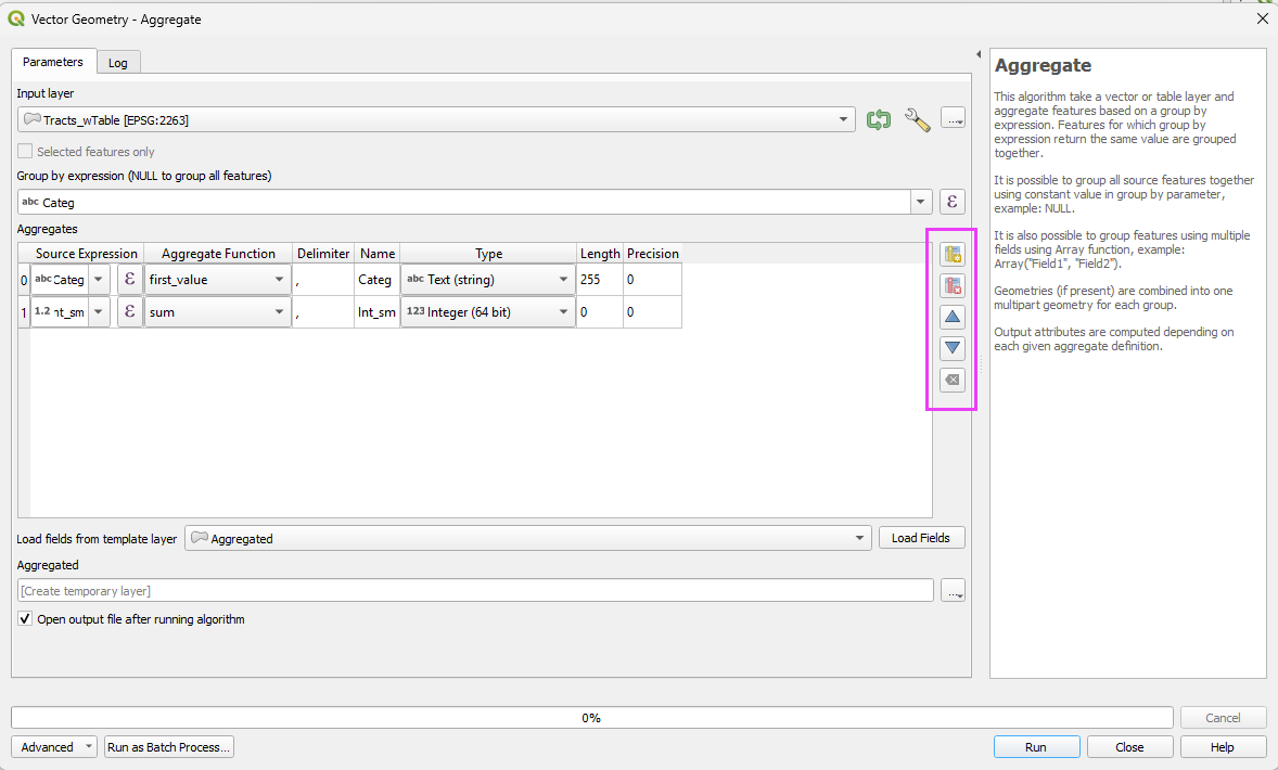 Aggregates: By default the Aggregates list includes all attributes in the input layer with default options for how to summarize feature values.