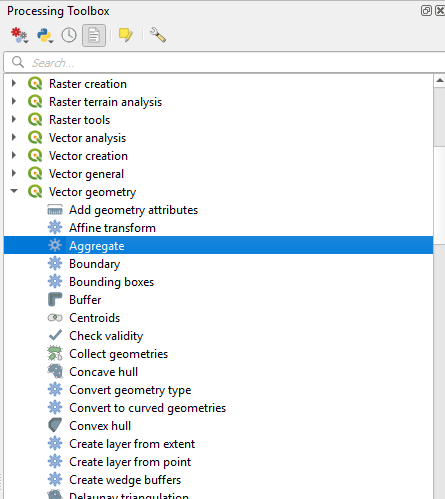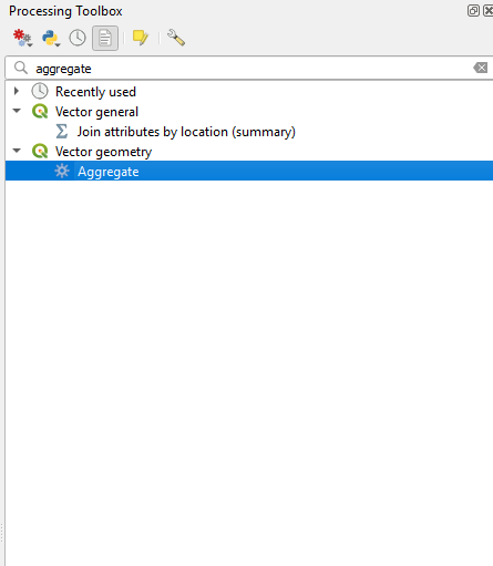 To access the Aggregate tool in QGIS, you can navigate through or search the Processing toolbox.