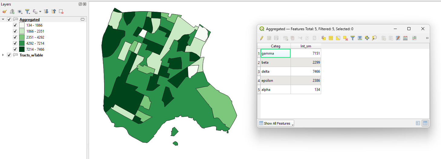 After running the tool, we see that our results are as expected. We have multipart features that correspond to the Categ field values used to group the input features, each with a calculated sum of the input layer’s Int_sm attributes.