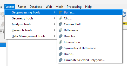 Buffers are polygons generated based on distances from input vector features. They can be generated using the Buffer tool, with constant distances or values within the input layer’s attribute table.