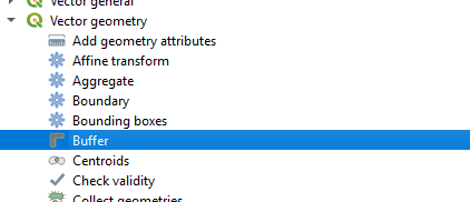 You can find the Buffer tool by clicking through the main menu under Vector > Geoprocessing Tools > Buffer. Alternatively you can navigate through or search the Processing toolbox.