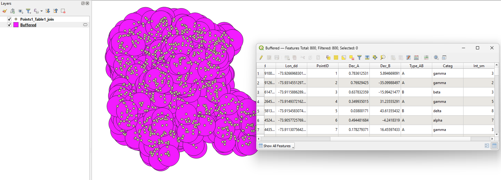 Because the inputs are point features, the output comprises circular polygon features surrounding each input point. Notice that the input attributes are maintained within the buffer layer’s attribute table.