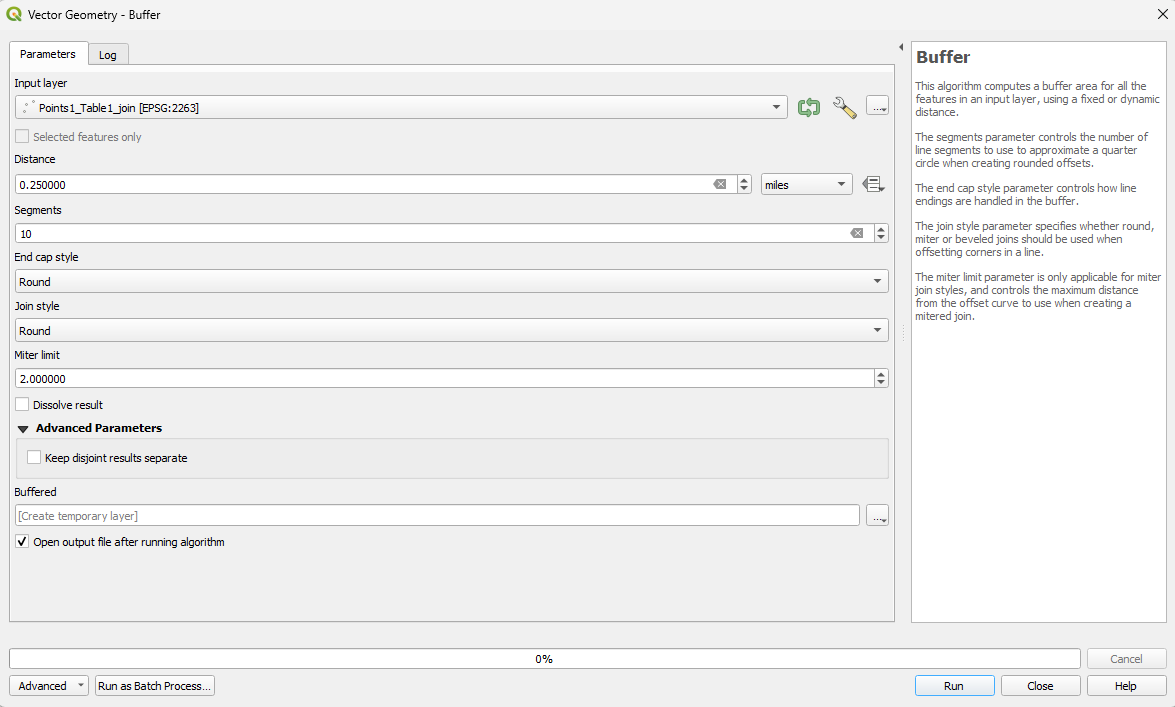 The Segments, End cap style, Join Style, and Miter Limit options allow you to specify the geometries are curved and how they are treated when they meet. The tool’s description panel provides more detail on each.