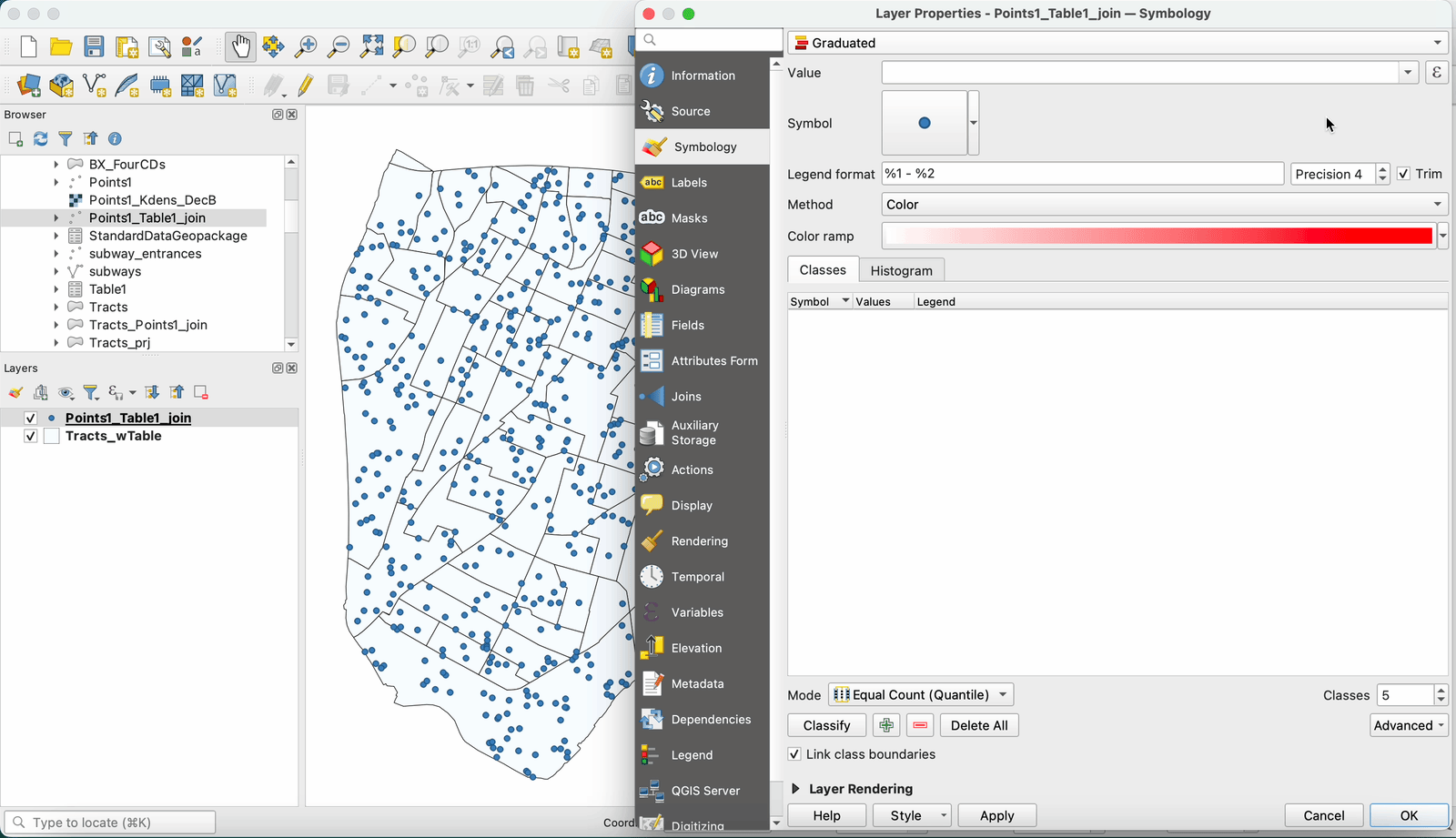 - Choose the classification mode and number of classes. In this example we will map these polygons’ attribute values in quintiles: five classes each containing the same number of features. For more on classification methods, see Classifying Features by Quantitative Attribute Values.