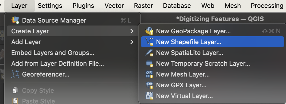 To create a new vector dataset, access the tools to create a new layer. You will find these tools within the main menu by clicking through Layer > Create Layer. There you will find multiple layer options (geopackage layer, shapefile layer, etc.) In this tutorial, we will demonstrate with a New Shapefile Layer.