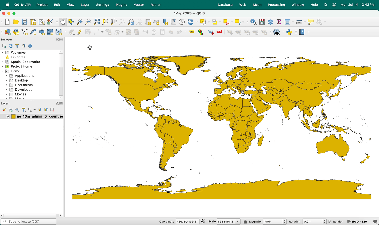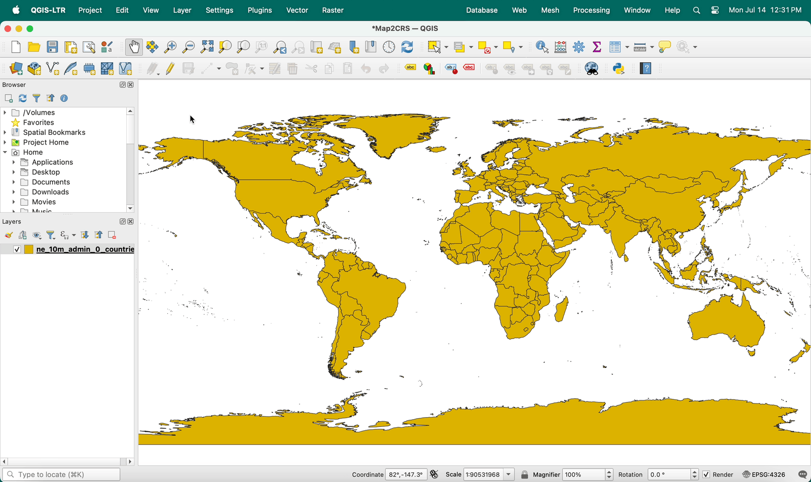Next, browse or search for a specific CRS. In the example below, the World Miller Cylindrical is found by clicking through Projected > Miller Cylindrical.