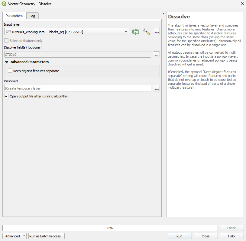 Dissolve field(s): This optional parameter allows you to select one or more fields from the input layer’s attribute table to serve as the basis of the dissolve operation.