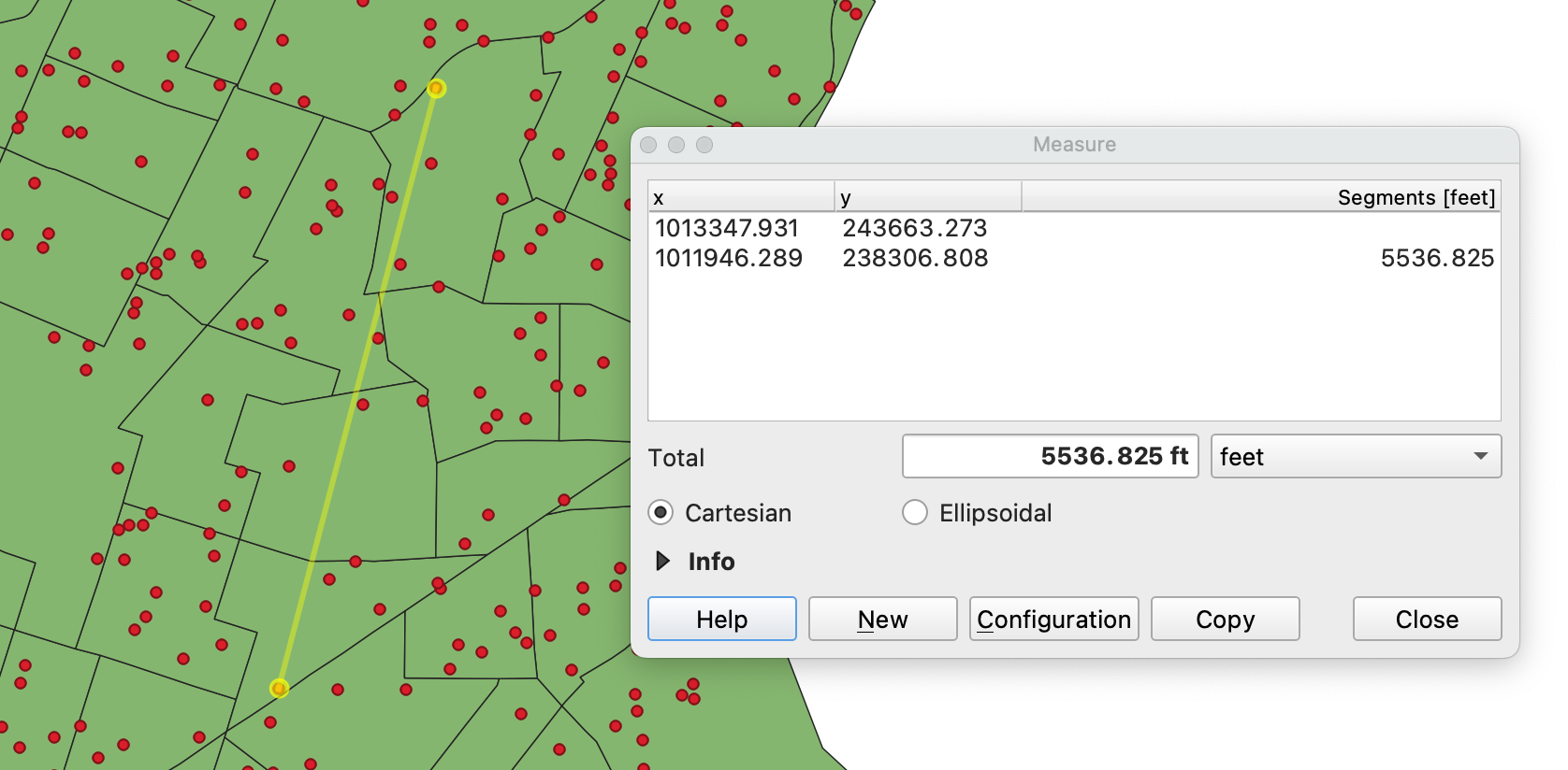 In the example below, the tool is measuring distance in feet on a cartesian surface. The dialogue box displays the total measurement: 5536.825 feet. Segment measurements can also be found in the dialogue box under Segments [feet].