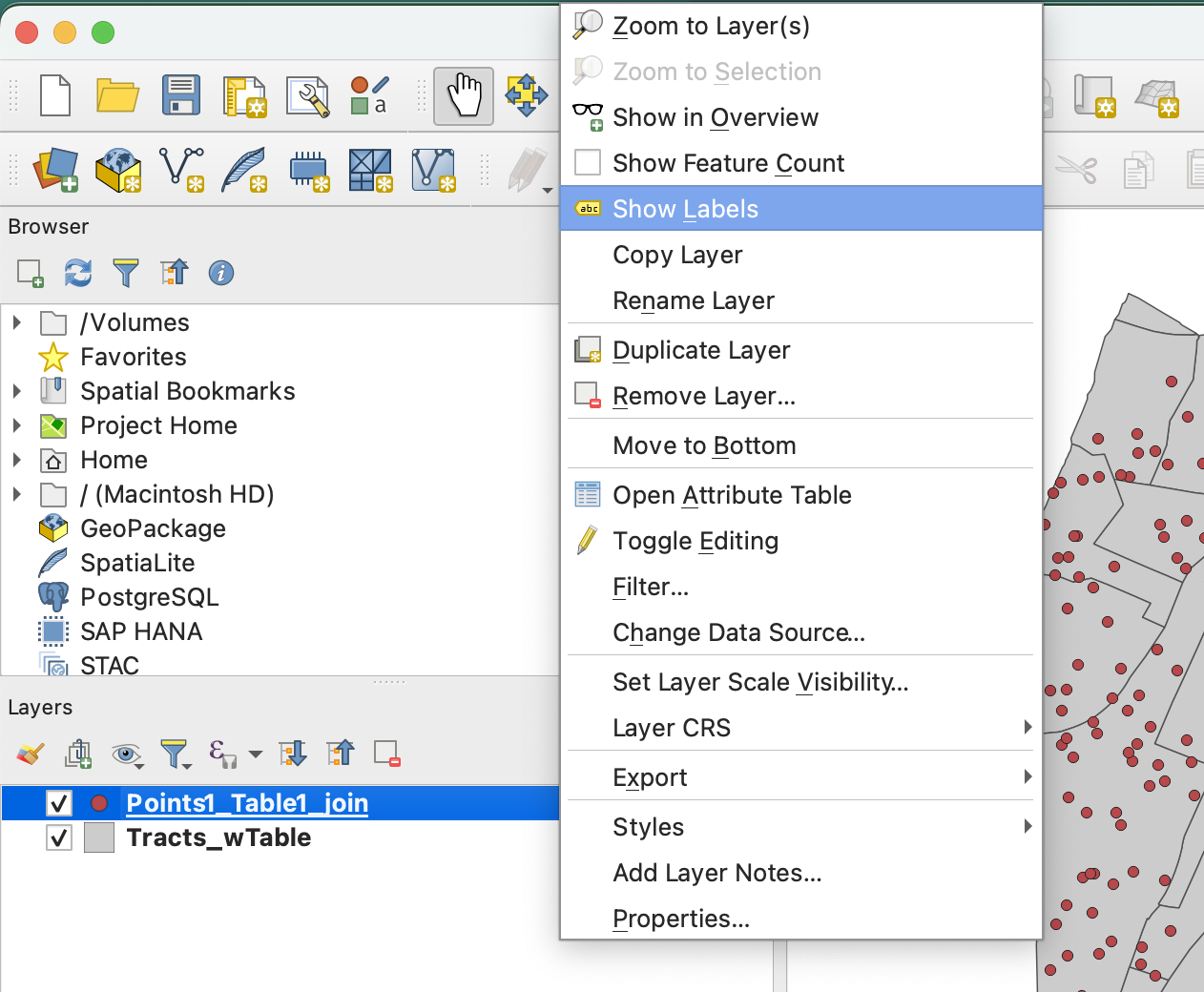 To access the labeling functions, right-click on the layer’s name in the Layers panel and click Show Labels.