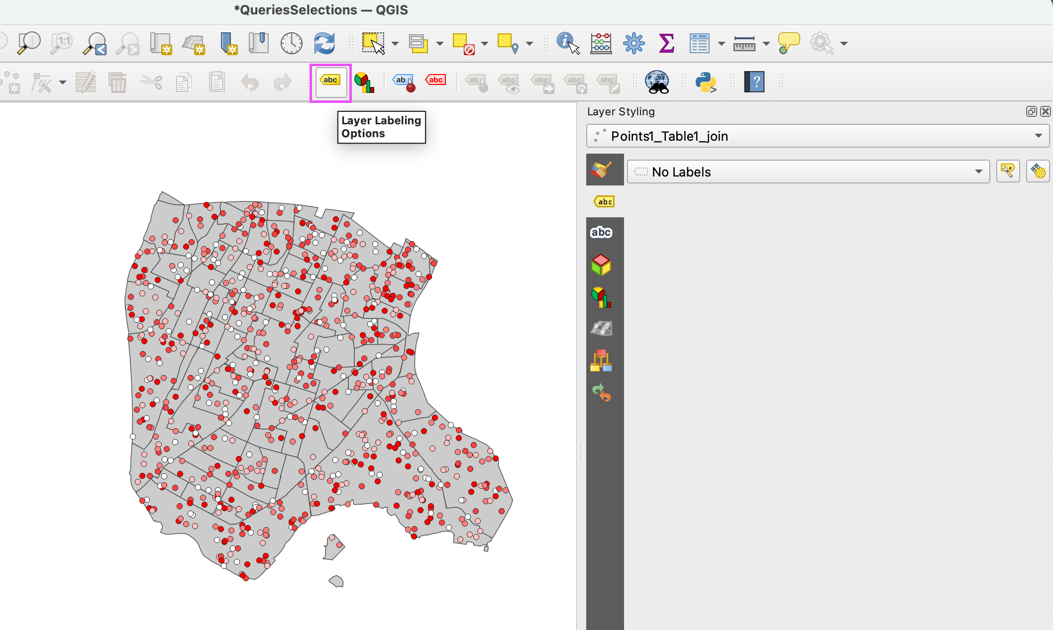 Labeling options are also found in the Layer Styling panel. One way to bring this up is by clicking the label icon (highlighted below) in the Label Toolbar.