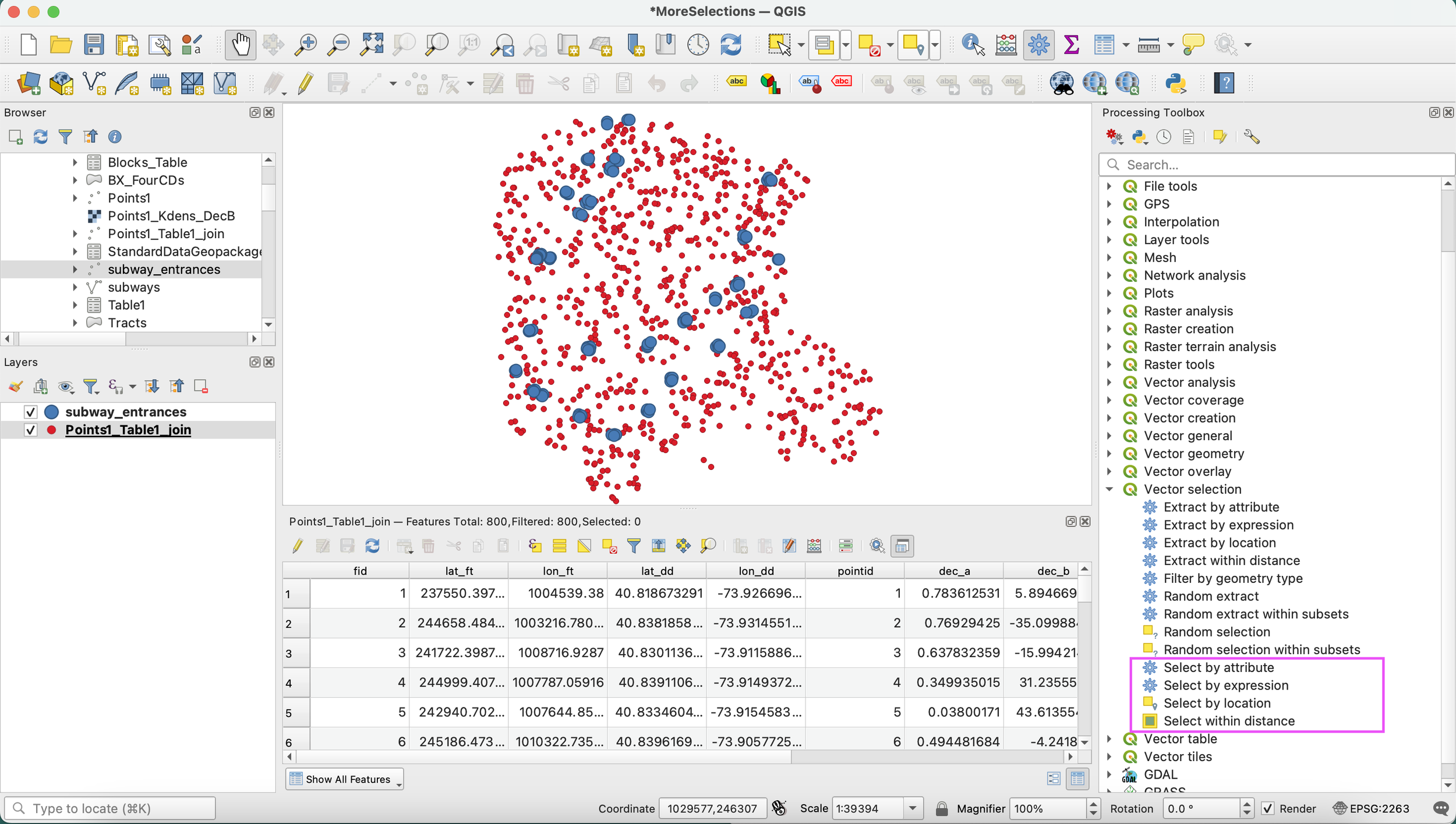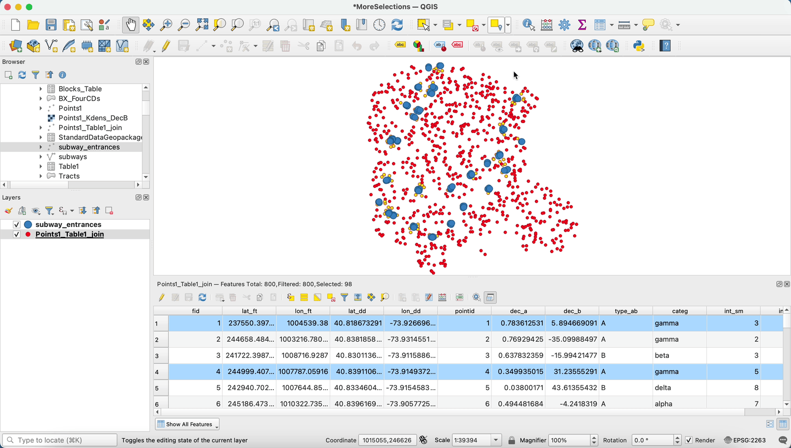 NOTE: These are selections made in the Querying based on Spatial Relationships tutorial. Here we already have the 98 features in the “Points1_Table1_Join” layer within 500 feet of a subway entrance.