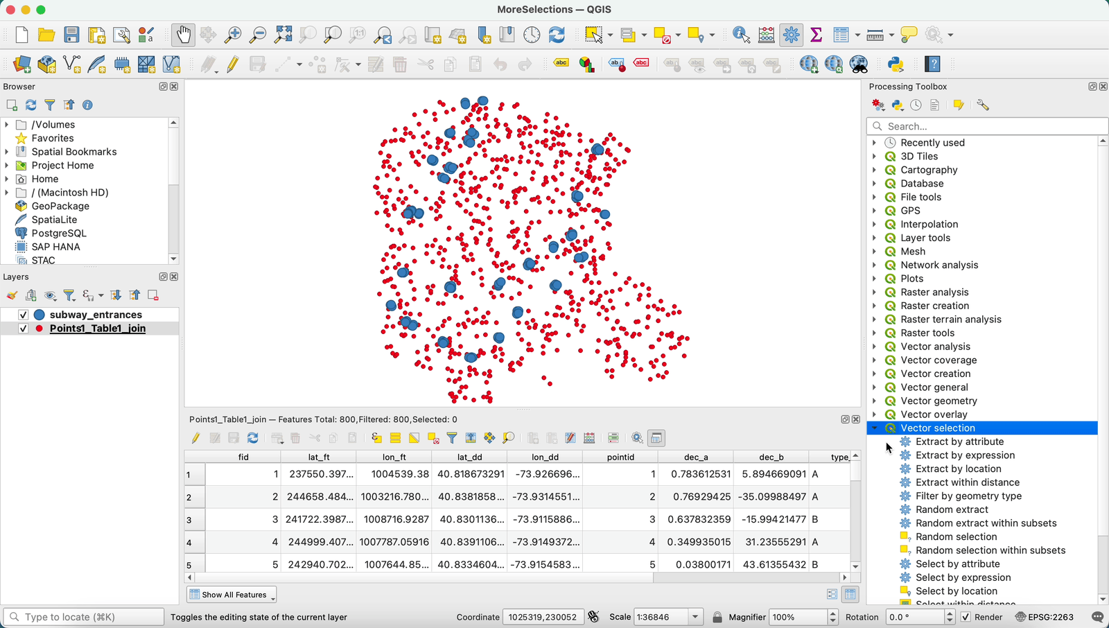 The selection operations are also available as tools within the Processing Toolbox. These are useful when automating steps using QGIS’s Model Designer.
